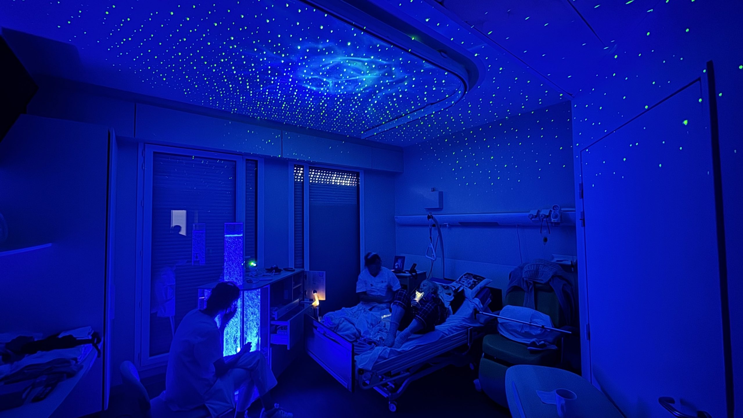 Dans un environnement calme et feutré, la vue, l’ouïe, le toucher, l’odorat et le goût sont sollicités : lumières douces, sons apaisants, senteurs subtiles, matelas à eau vibrant au rythme d’une musique choisie. L’objectif ? Favoriser le lâcher-prise et créer un moment de présence partagée, à la fois pour le patient et pour le soignant.