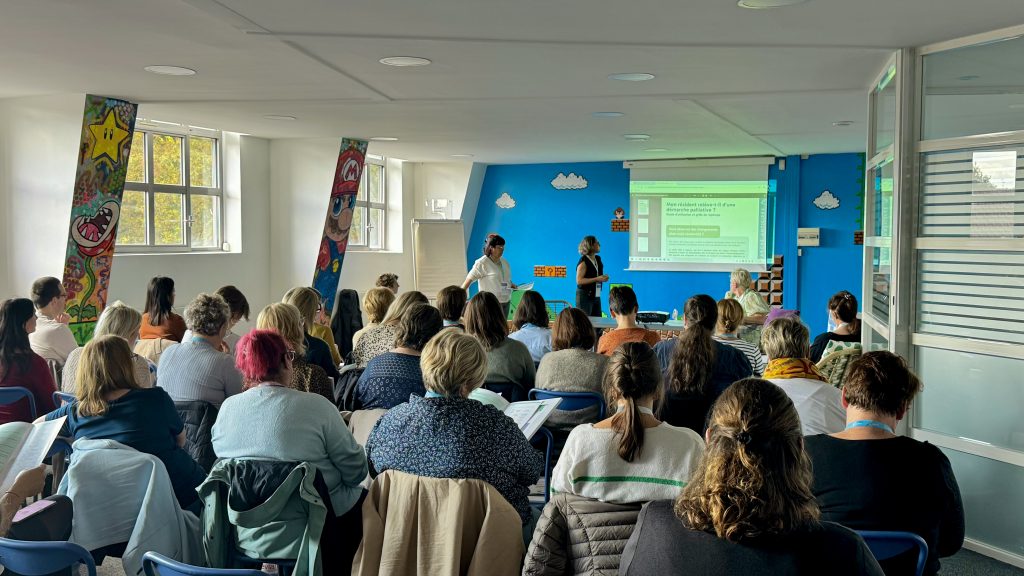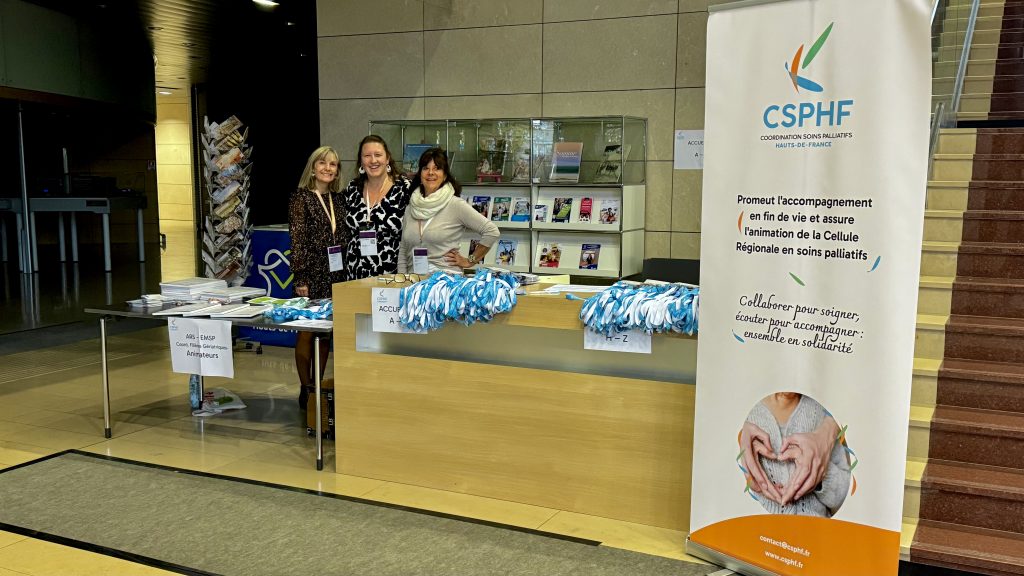La matinée se poursuiva avec la présentation officielle de la plateforme numérique portant le PalliaKit EHPAD. Elle fut animée par Caroline CWYNAR et Lucie LEPAGE, de la Cellule d’Animation Régionale Soins Palliatifs Hauts-de-France.