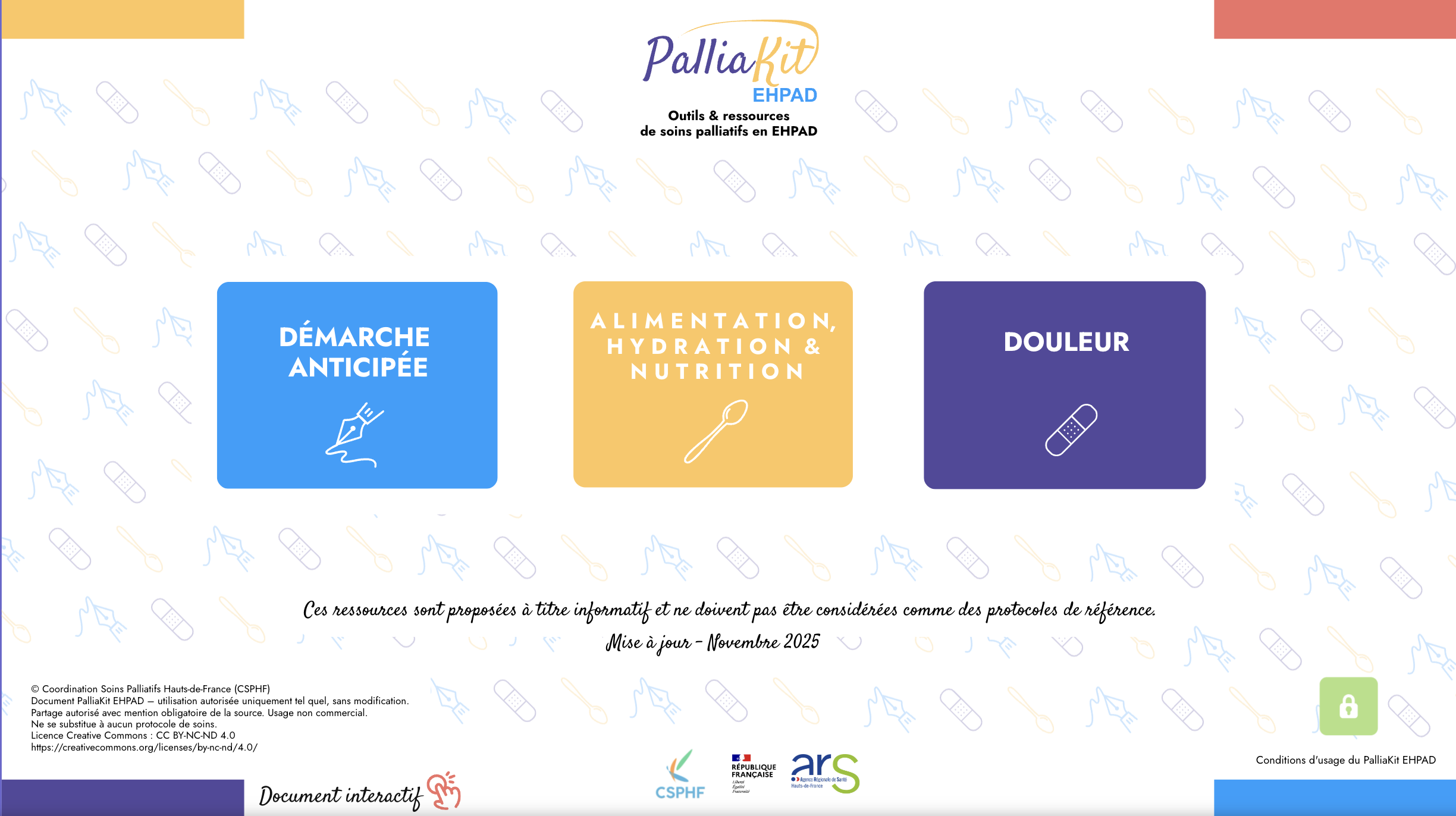 Le PalliaKit EHPAD est un outil régional élaboré et porté par la Coordination Soins Palliatifs Hauts-de-France (CSPHF). Il a pour objectif de soutenir le repérage, l’accompagnement et la réflexion clinique en EHPAD.